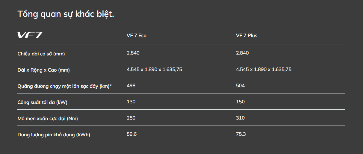 Quãng đường di chuyển tối đa sau mỗi lần sạc đầy theo tiêu chuẩn của phiên bản Eco là 498 km (dung lượng pin 59,6 kWh) và của bản Plus là 504 km (dung lượng pin 75,3 kWh), chi phí năng lượng trung bình trên mỗi km di chuyển của VF 7 cũng thấp hơn so với xe xăng giúp tối ưu kinh tế cho khách hàng trong suốt quá trình sử dụng.